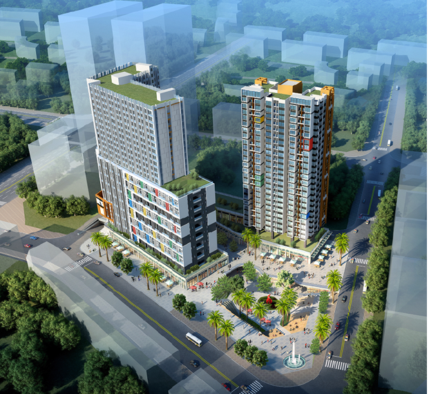 項目位于深圳龍華新區(qū),東臨至誠路,南臨建輝路,與龍華汽車站隔路相望,西側(cè)和西北側(cè)分別為一棟14層和31層建筑,項目用地面積9320.5平方米。